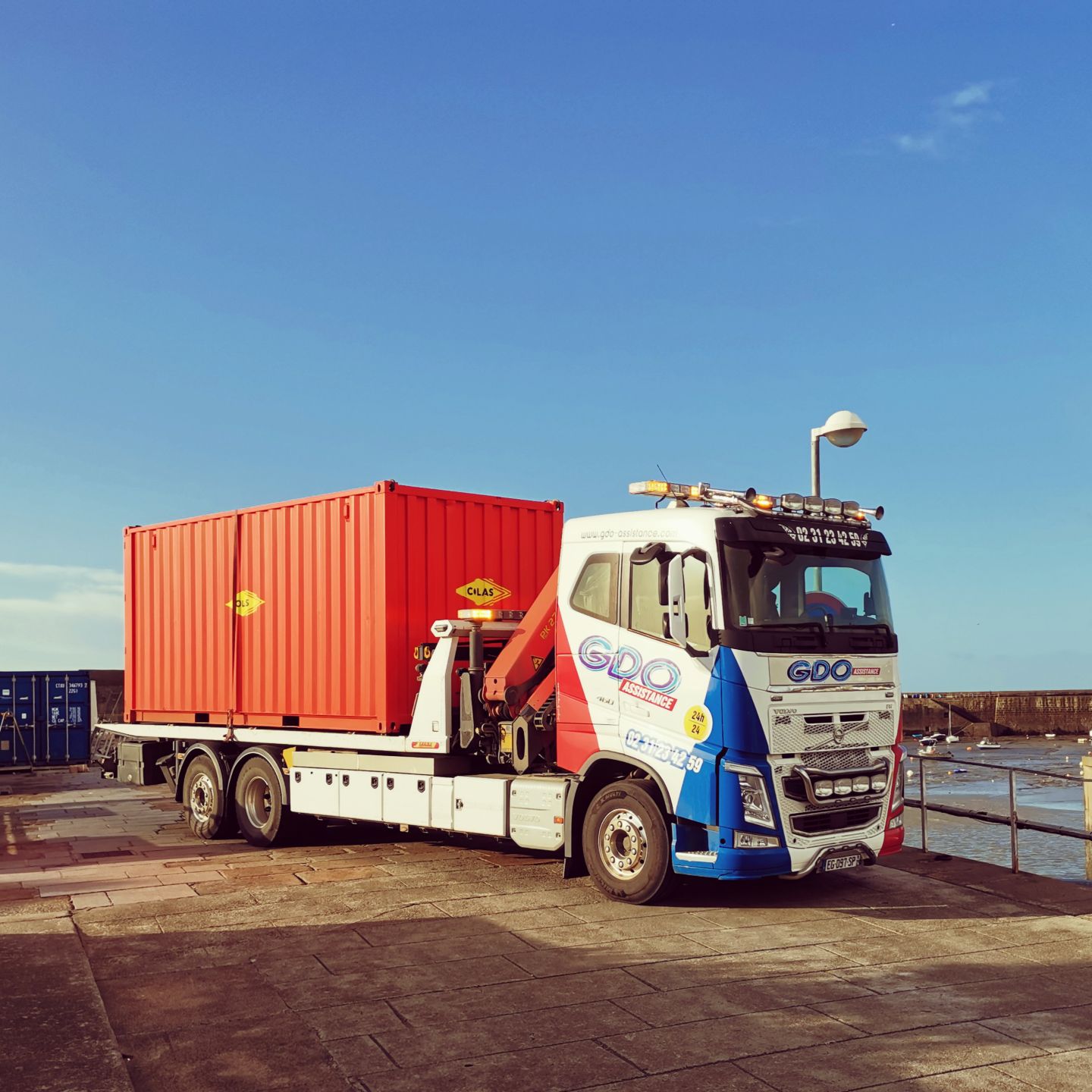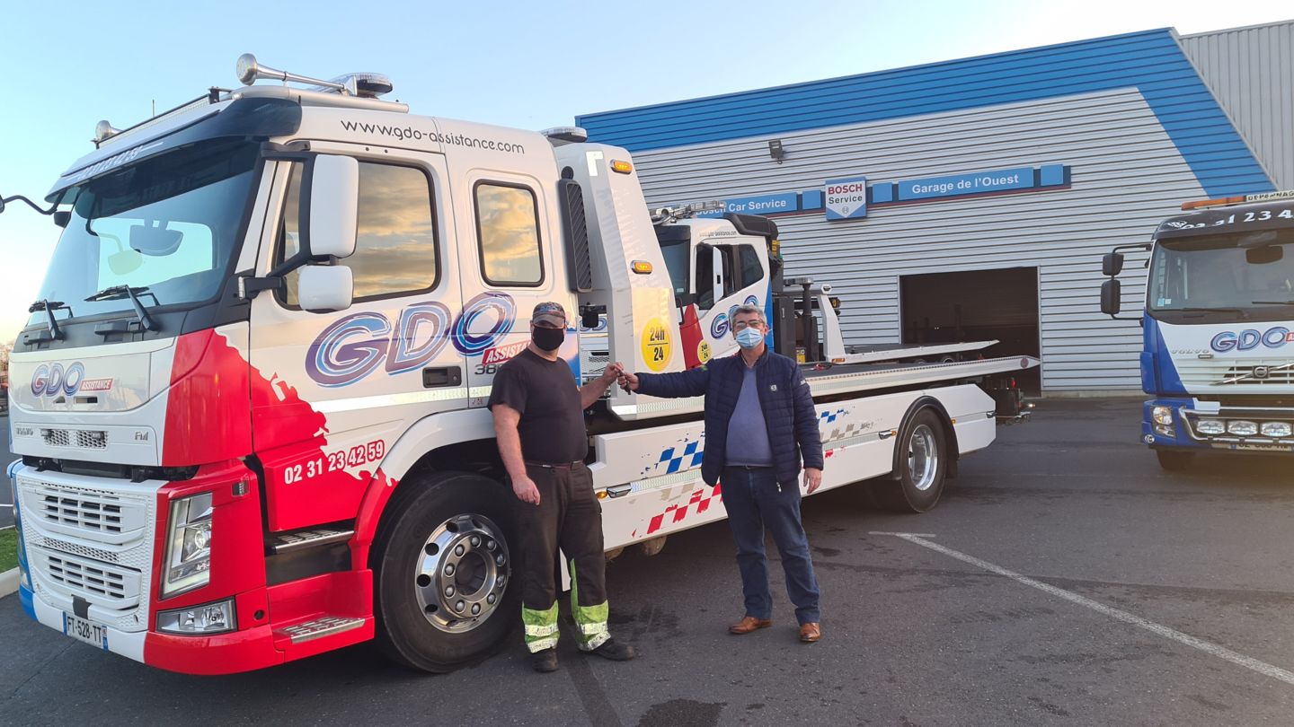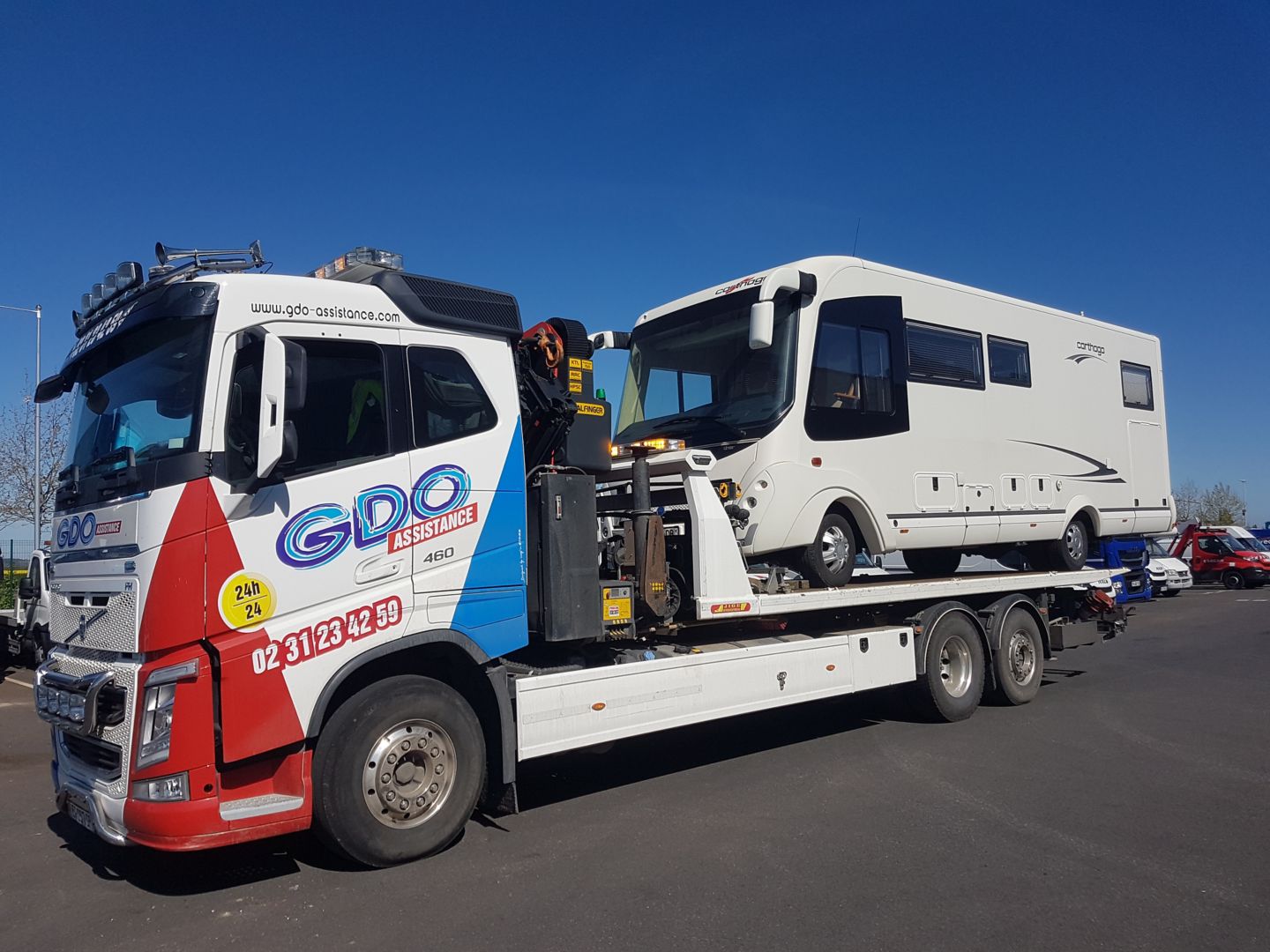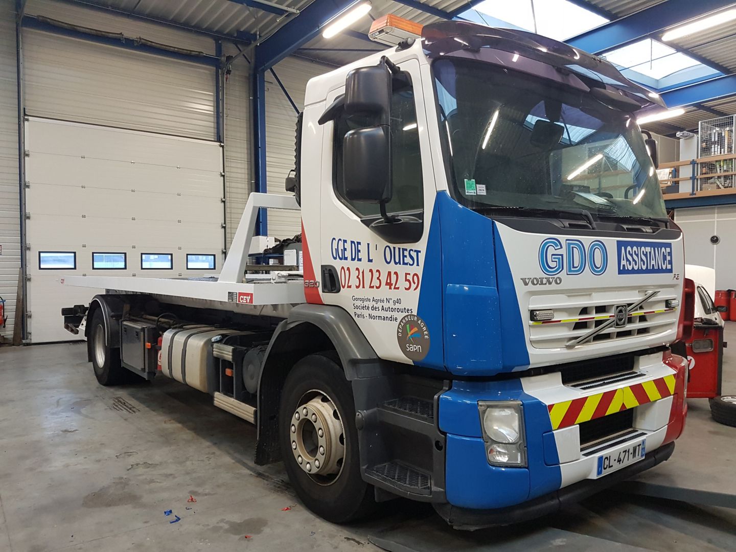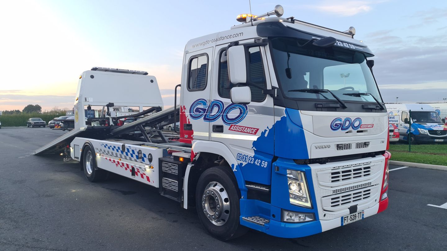 Cyril Desgrouas est aussi propriétaire d’un FH très particulier et polyvalent, avec sa charge utile de 7 tonnes, équipé d’une grue Palfinger d’une capacité de 27T/mètre, d’un un panier de remorquage et d’un plateau coulissant qui se pose pratiquement au sol, idéal pour les voitures basses mais surtout pour les camping-car avec un grand porte à faux. Ses équipements permettent aussi d’assurer le chargement de bungalows et containers pour sa société de transport « GDO Transport », activité en plein développement qui est gérée par Simon Desgrouas le fils de Cyril.