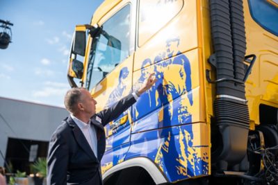 À l’occasion des 80 ans de l’entreprise, Volvo Trucks a tenu à marquer le coup avec une surprise de taille : la livraison d’un Volvo FH16 flambant neuf, décoré d’un habillage événementiel autour des 80 ans de l’entreprise. Une initiative imaginée par Morgan Manac’h avec la complicité des proches de Bertrand et de l’équipe communication, et réalisée par Oyat Design, qui a profondément touché le dirigeant.